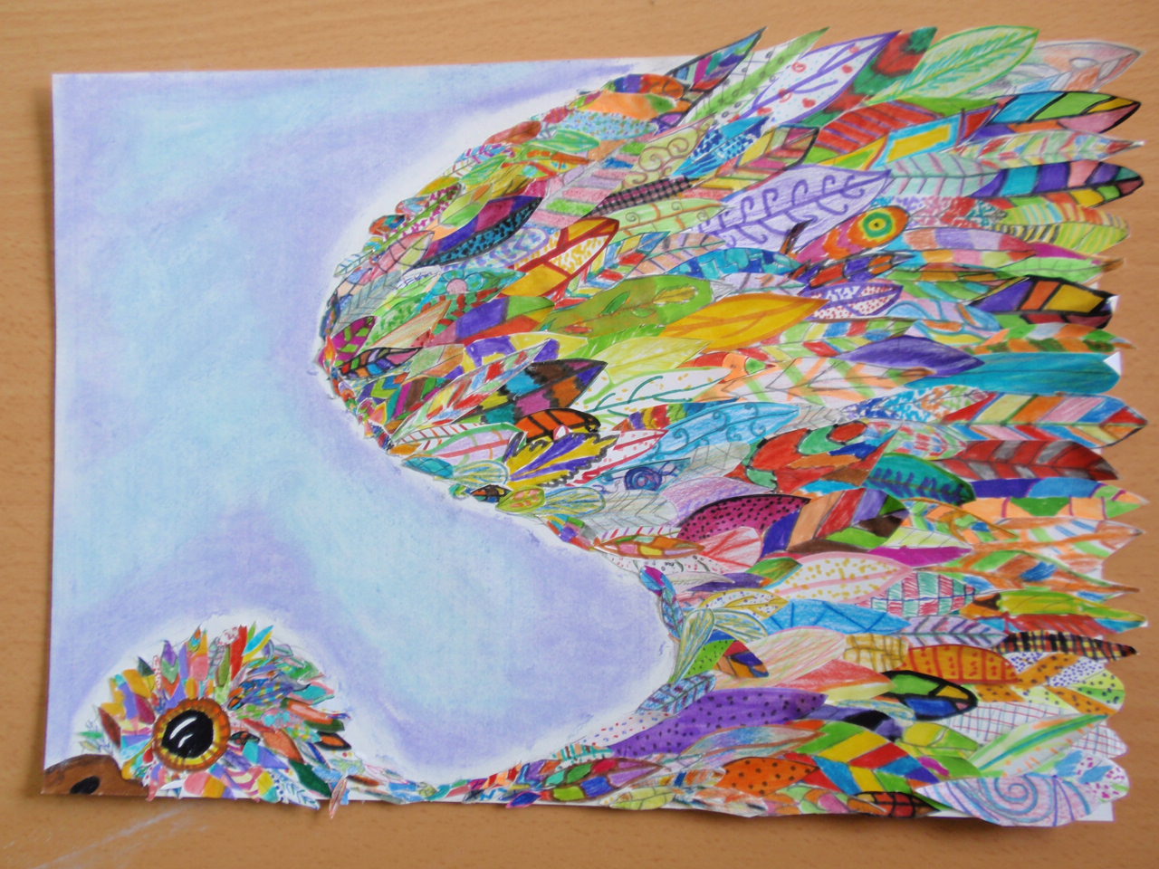 El trabajo fue realizado de forma colectiva por todos los alumnos y alumnas de la clase de quinto B. Podéis ver el resultado del trabajo en este mismo blog, en el mes de mayo. Hicimos un ave de mil plumas diferentes a modo de mosaico.